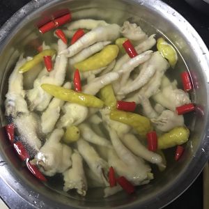 然后把之前准备好的材料倒入冷却好的鸡爪中.