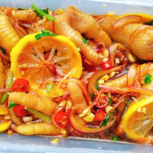 将鸡手洗净,剪掉指甲,剁成两段。在冰箱里准备一盆冰水。