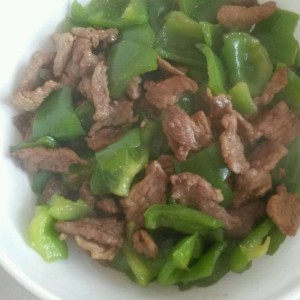 锅里放油,油热后放入葱,花椒爆香,放入腌制好的肉搅拌,待肉熟之后加入盐,放入青椒片,之后等青椒变色熟了之后出锅