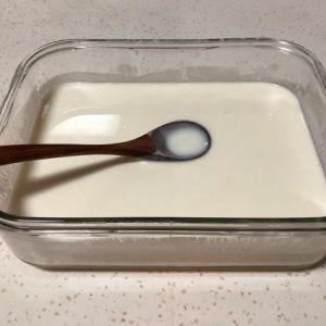 去掉奶皮,加入菌粉搅拌倒入碗中,盖上保鲜膜,烤盘中放入二分之一的温水,放入烤箱选择发酵功能,35度7小时。