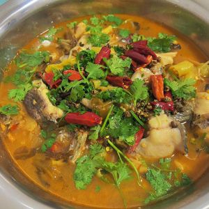 3️⃣ 炒锅下油,爆香蒜片和姜片小米辣青辣椒和火锅底料,倒入酸菜,炒出香味后加入刚才煮好的鱼汤,加入小米辣青辣椒,汤开后加入腌制好的鱼片,不要一次性倒入锅中,要一片一片放进去,待鱼肉变白加入自己喜欢的配菜,煮至成熟,然后倒入碗中,