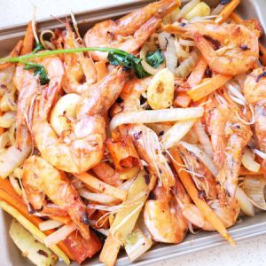 锅底油烧热,先放大蒜姜片爆香+胡萝卜洋葱炒软+调料+虾和香菜翻炒几下出锅。