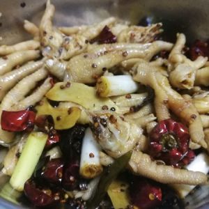 鸡爪里放入备好的材料根据自己的口味增添泡椒水,醪糟不用太多,我这里没有放完。
