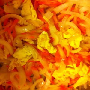 锅中放油,放葱花,姜丝,放胡萝卜,洋葱丝,炒熟,放炒熟鸡蛋,放盐。
