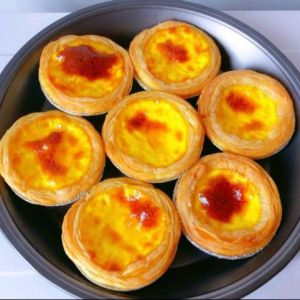 然后把调好的蛋挞液倒入蛋挞皮中,倒八分满即可,因为在烤制的过程中会膨胀