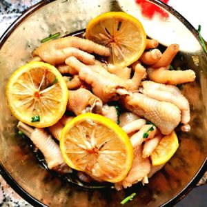 爪子洗干净,切成两半,冷水放进锅,放入2勺料酒,姜片5片,葱1根。大火转中火10-15分钟,随自己喜欢的口感而定。然后马上放入冰水中,泡5分钟,再放入冰箱保鲜层20分钟。