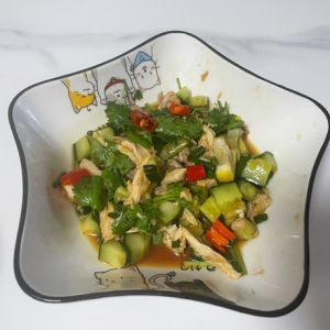 配料(小米椒、黄瓜、白醋、生抽、蚝油、蒜末、香菜、)放入手撕鸡里搅拌均匀
