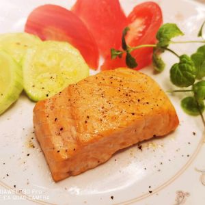 烤箱预热180℃,烤20到30分钟左右(根据三文鱼的厚薄),直到边缘稍稍有点焦