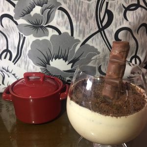 巧克力磨碎。取一个杯子,倒入冷藏过的糊,加入布朗尼蛋糕,铺上巧克力碎,用筛子撒上可可粉,点缀自己喜欢的装饰物,完工。