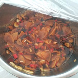 白萝卜切薄片,用盐腌制一个小时左右,倒掉里面的水,这期间,大蒜切片,干辣椒炸辣椒油,小米辣切小碎段