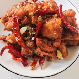 净锅烧少许油依次下入姜,蒜,花椒,葱,干辣椒炒香下肉调盐,味精,鸡精,糖翻炒均匀出锅装盘即成。