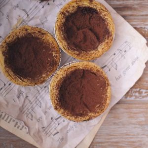 准备好的蛋挞壳底部加入可可酱,每个塔壳中大约放5—6克