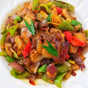 姜蒜爆香后,放入洋葱,青红辣椒爆炒出香味!
