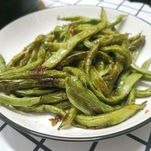 比平常炒菜多一半的油,放入四季豆煎至表皮皱