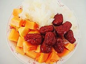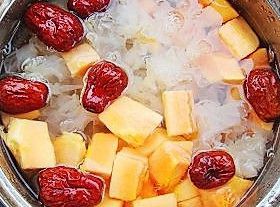 把木瓜块、银耳和红枣、放入锅内,大火烧开后转小火煮30分钟至一个小时,关火前10分钟放入冰糖。