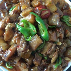 倒少许油把炸好的茄子大蒜西红柿辣子盐一起倒入锅中炒三分钟盛盘