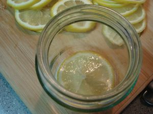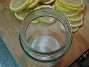 然后就这样一层砂糖,一层柠檬片的层层铺好~~装满后盖上密封盖,放在阴凉的地方让它慢慢腌吧~~~哈哈~~~传说是要腌上个把月~~~不知道我有没有那个耐心等到那一天~~~哈哈哈~~~