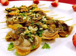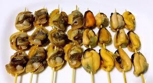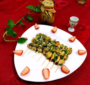 将煮好的毛蚶和海虹串起来