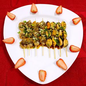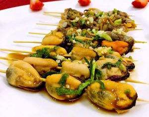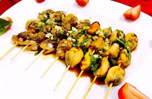 调好的料汁均匀的淋在海鲜串串上