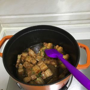 放入五花肉,翻炒,加入料酒少许,翻炒下,闻到酒香味,加入生抽,老抽,翻炒!咸淡自己把握!我是瓶子倒的,也说不上多少好事!