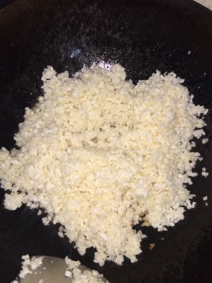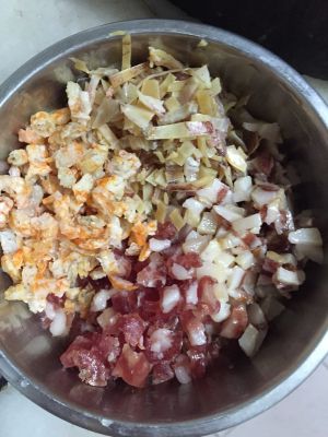 加入马蹄翻炒,因为有淀粉,容易粘锅,加入蚝油、盐翻炒,炒至马蹄和配料均匀混在一起,可以上碟晾凉