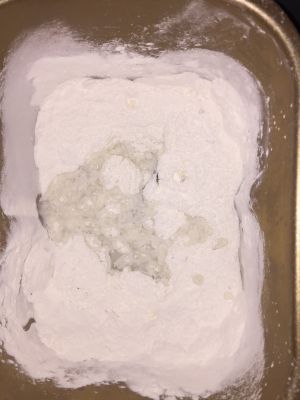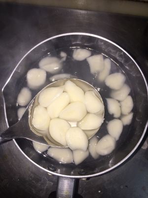 煮熟的小团捞起放入粘米粉糯米粉中,用筷子搅拌。有面包机可以放入机器搅拌,逐量加入冷水,拌至能揉成团,我大概加了100g左右水。如果面团很粘手,说明水多了,加些粘米粉即可