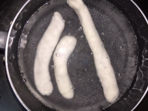面在水中煮熟硬后,将其剪小块并煮熟。