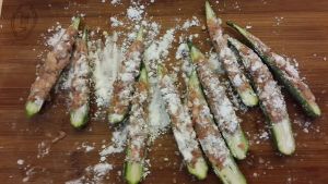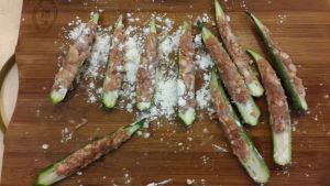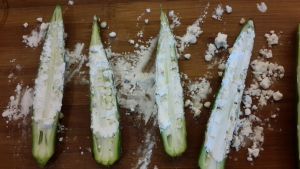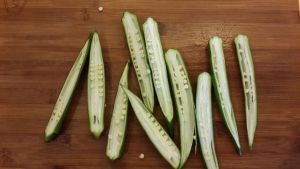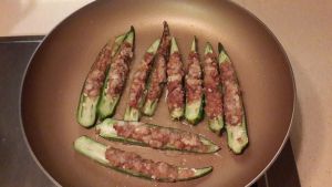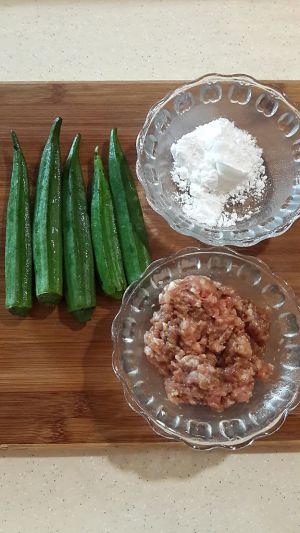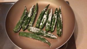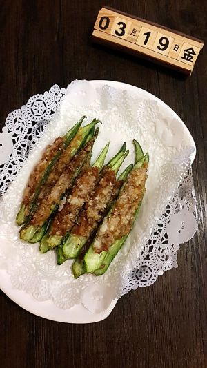 锅里放油 油五成热的时候放进酿好的秋葵(有肉的一面先煎) 小火煎制 煎到肉完全变色后 大约3到5分钟