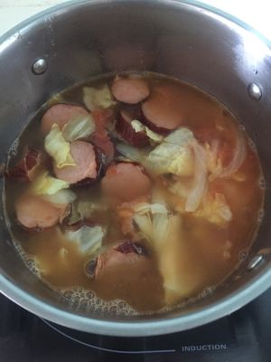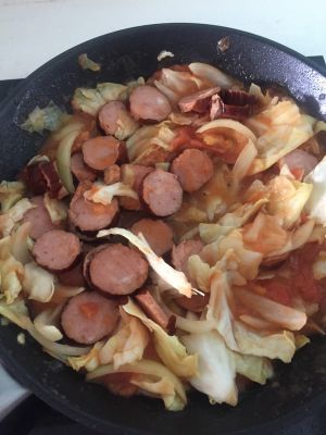 加入红肠(作者此处用的是东北红肠,带熏肉味儿,一般用上海红肠为宜),继续翻炒
