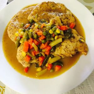 锅中倒入一碗水(200g左右)或高汤放入鸡肉煮7-8分钟,中间将鸡肉翻一面,放些蔬菜(也可以不放)把烤好的柠檬也同时放进去。
