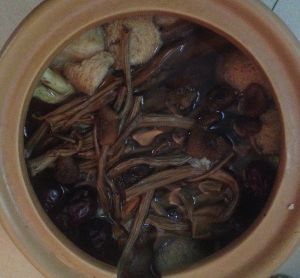 煲开后加入茶树菇再次煲开,大煲10分钟后调小火煲90分钟