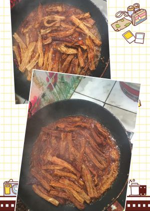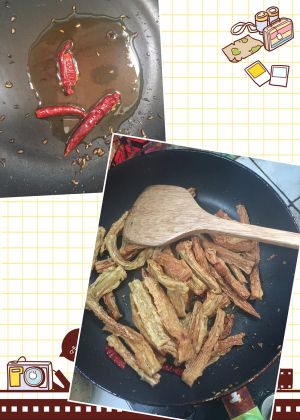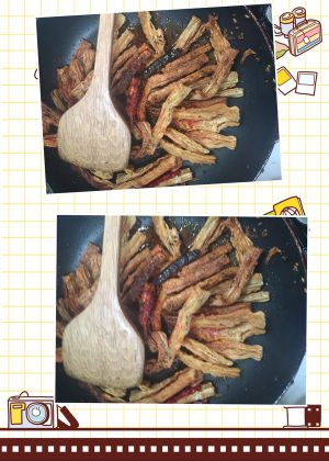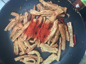 放入辣椒煸炒一下,加入炸好的腐竹炒香