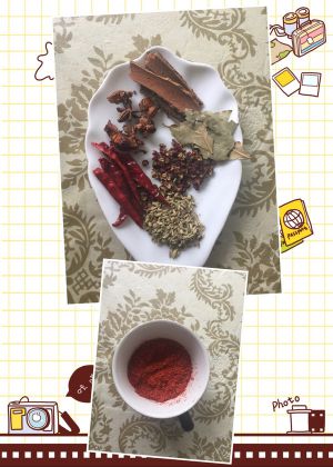 准备食材(八角,桂皮,辣椒,花椒,香叶,小茴香籽,辣椒粉)