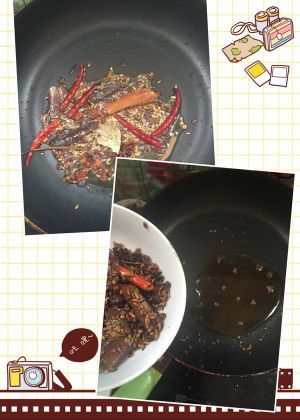 锅里放入少量油,把香料炸香后,捞出香料!(也可以不捞出香料,放在一起煮,这样味道很好吃,更浓郁!)