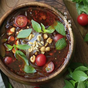 在碗里加些煮粉的开水,在加入生抽2勺、陈醋3勺、辣椒油1勺、熟花生仁1勺、熟芝麻1勺、芝麻油1勺以及3勺炒好的肉末。最后放入熟花生碎和熟芝麻,放几个小切开的小番茄装饰一下,青菜可以根据自己的喜好来定。我放的是荆芥,大家也可以放香菜或是小葱。
