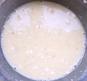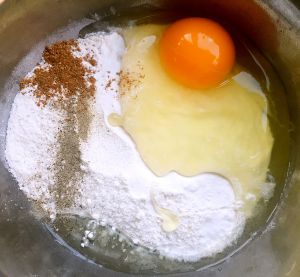 准备煎三文鱼的面糊,容器中放入面粉、鸡蛋、黑胡椒粉、五香粉、盐、糖