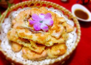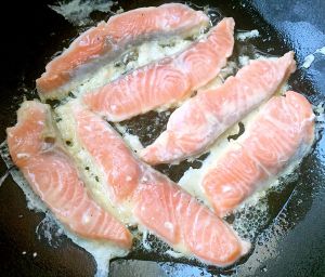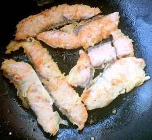 不粘锅中放入底油加热裹好面糊的三文鱼摆入锅中