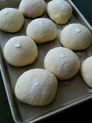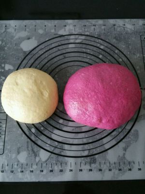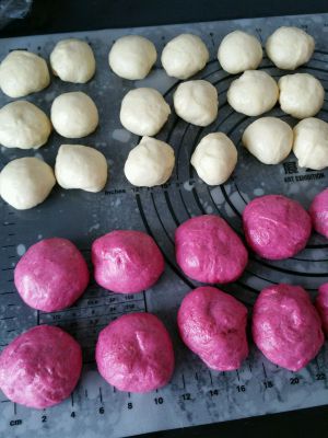 各自平均分成18个,白面团每个约27g ,火龙果面团每个约53g
