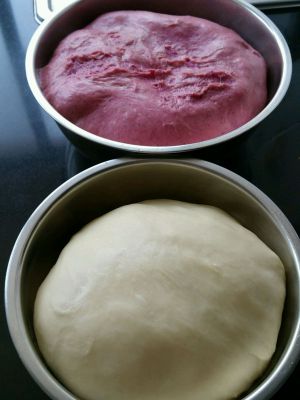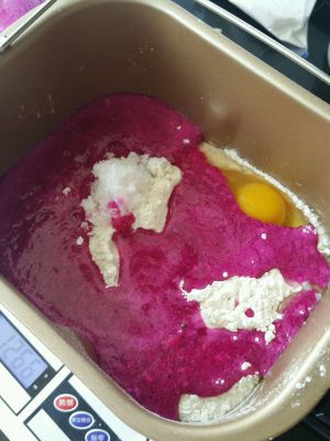 火龙果面团:除黄油外所有材料放入面包机,设定自助和面半小时,十分时加入黄油至结束