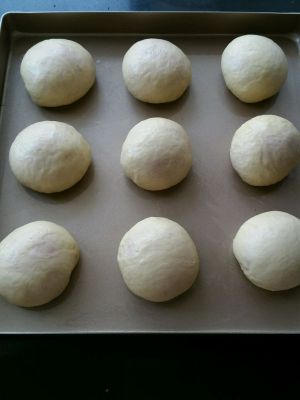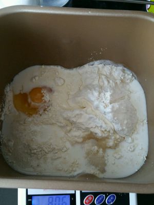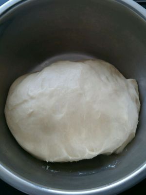 白面团:除黄油外所有材料放入面包机,设定自助和面半小时,十分钟时加入黄油揉至结束