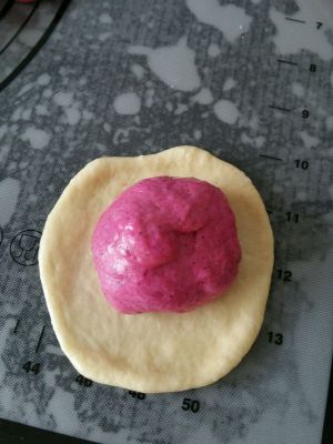将白面团擀成皮包住火龙果面团,像包包子一样,收口向下
