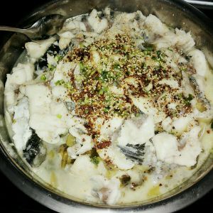 鱼片用清水烫熟,装锅,洒上葱花,辣椒面,花椒粒,烧开热油洒上去。