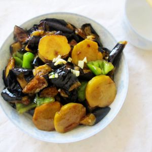 下入控好油的土豆和茄子,煸炒,加酱油,糖,盐调味,并加水淀粉勾芡。