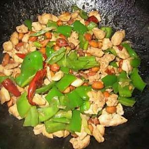锅里留少许油,放入葱和干红辣椒炒一下,倒入青椒,加入佐料,大火翻炒后再加入炸好的花生米,再倒入炒好的鸡丁,翻炒后淋明油即可。