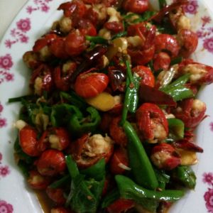 小龙虾1500克、青椒4个、红干椒少量、生姜一块、葱少许