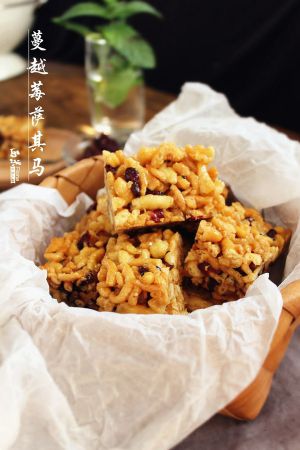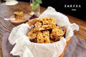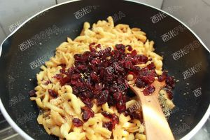 熬糖浆,把水,白砂糖,麦芽糖一起放进不粘锅里,小火,用锅铲不断搅拌。熬到用筷子蘸糖浆能拉出丝来,就把炸好的面条,芝麻,蔓越莓一块倒进去,快速拌均匀。