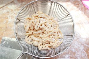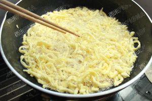 锅里倒入花生油,6成油温下。炸金黄捞出。每次不能放太多面条,不然会膨胀的整锅都是。小火,用筷子翻动几下。让它炸的更均匀点。