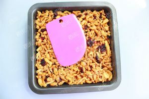 倒入事先抹了油的模具里面。我用的是8寸的方模。趁温热,用手压实了。