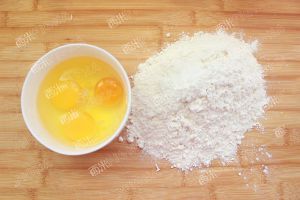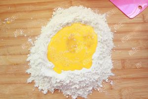 面粉混合无铝泡打粉,倒在揉面板上,中间挖个坑。三个蛋打散。