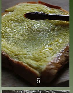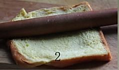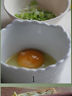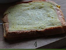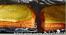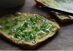 鸡蛋打匀 用毛刷(我是用的是毛笔赫赫)蘸蛋液刷在面包片上 洒上葱花